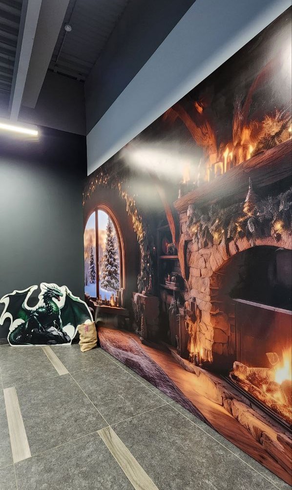 Доминантой праздничного настроения стал медиацентр компании, превратившийся в настоящий дом хоббитов с огромной новогодней елкой и настоящим камином. Дополняют композицию сказочные предметы интерьера, такие как деревянные стулья, стол и бочонок с напитком. Все они выполнены в стиле, характерном для мира Средиземья, и создают атмосферу приближающего праздника. А величественный дракон охраняет сокровища гномов – драгоценные монеты, спрятанные в сундуках.