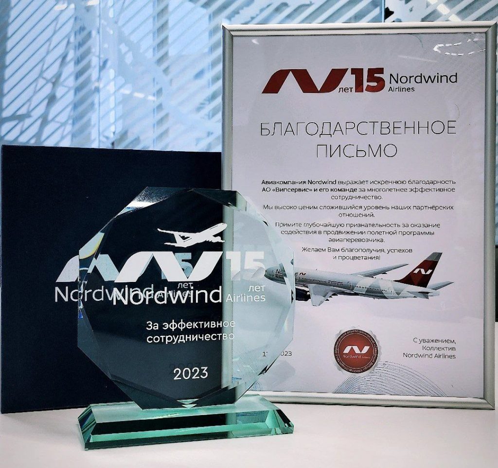 5 декабря 2022 года авиакомпании Nordwind Airlines исполнится 15 лет! В честь такого значительного юбилея, авиакомпания решила выразить свою благодарность партнерам и холдингу Випсервис. Именно Випсервис стал первым, кто получил благодарственное письмо от авиакомпании Nordwind с памятной статуэткой «За эффективное сотрудничество».