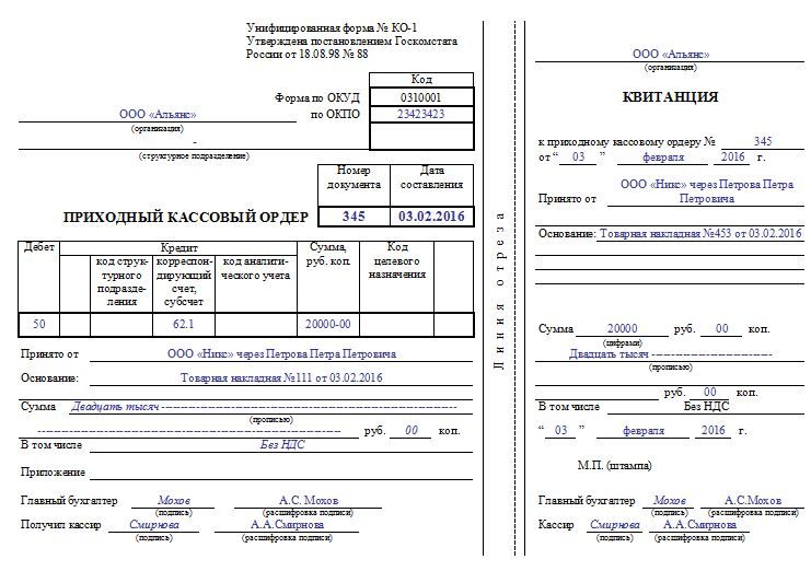 - Приходный кассовый ордер (ПКО) — его заполняет бухгалтер или руководитель компании.