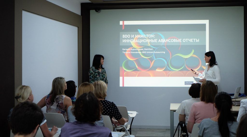 Традиционно в качестве спикеров выступили менеджер по развитию бизнеса компании Hamilton Apps Евгения Бурмистрова и директор по развитию бизнеса компании BDO Unicon Outsourcing Татьяна Климанова. В обсуждении вопросов также принимала участие директор по стратегическому развитию компании BDO Unicon Outsourcing Людмила Шустерова.