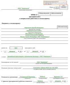 Приказ о направлении руководителя в командировку подготавливается по форме №Т-9, Т-9а или в свободной форме на фирменном бланке организации, закрепленном в её внутренней политике. В приказе обязательно указывается срок, место и цель командировки руководителя, после чего документ подписывается им в качестве генерального директора организации и в качестве командированного сотрудника.