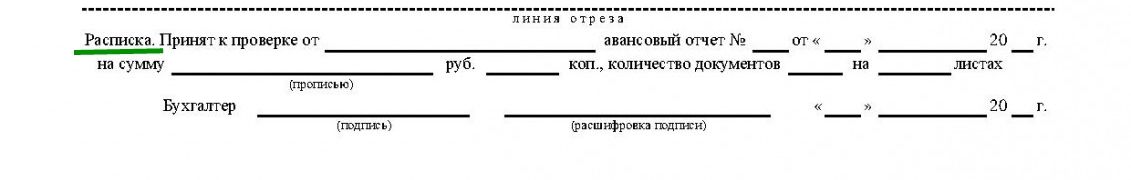 На руки подотчетное лицо получает от бухгалтера расписку (отрезная часть предусмотрена в форме авансового отчета), в которой обозначается дата принятия на проверку, номер и дата самого документа, список приложенных к нему подтверждений и итоговая потраченная сумма.