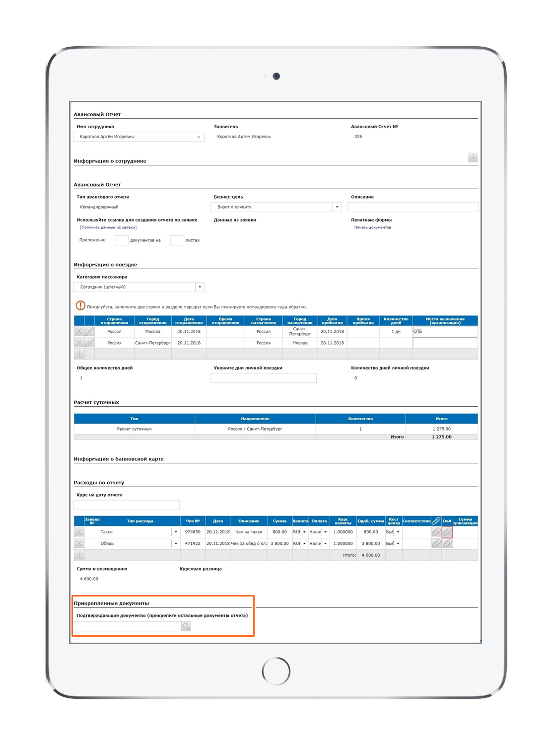 На изображении выше представлен пример авансового отчета по командировке, однако в приложении можно отчитаться по любому виду расхода. Обратите внимание, что вся информация о компании и сотруднике уже заполнена по умолчанию, ему остается только внести свои расходы — приложение подскажет, куда именно, подсветив поля красным цветом.