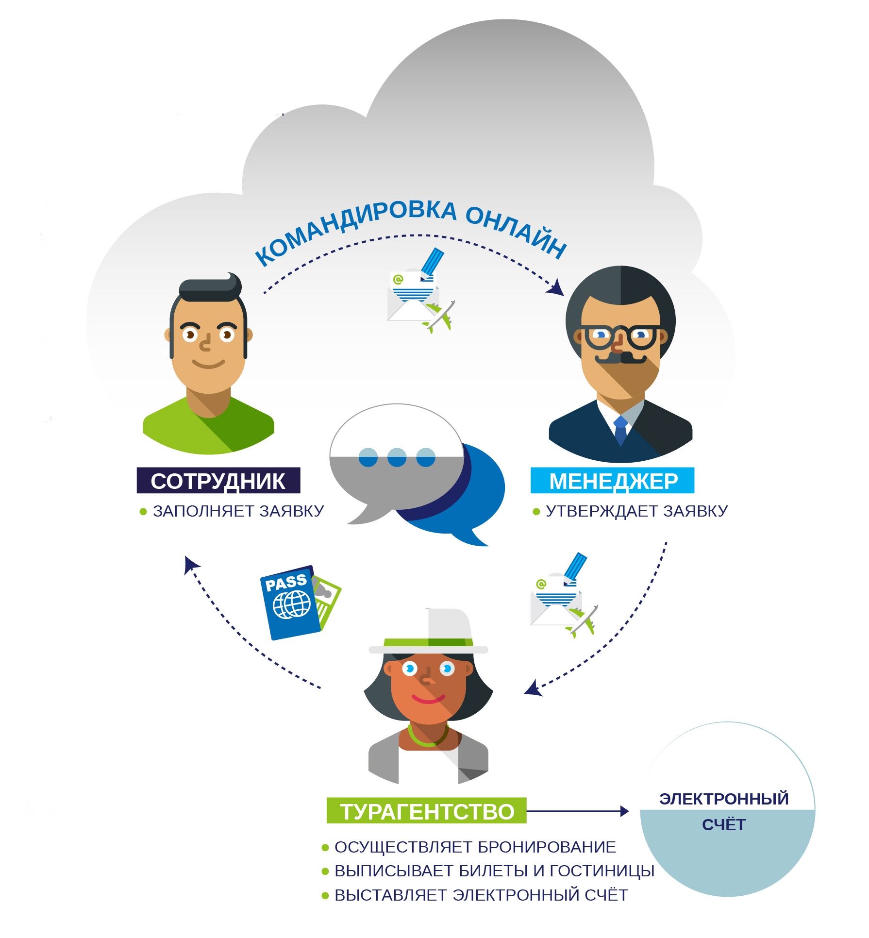 Последовательность согласований, все действия настраиваются в приложении под нужды конкретной компании. Бронировать билеты и номер может как travel-менеджер, так и сотрудник агентства, с которым компания заключила договор. Чаще всего при использовании такой системы роль travel-менеджера в компании отпадает.
